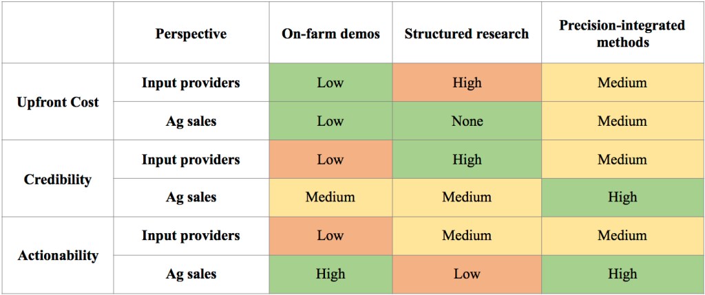 Table 2: Comparison of biostimulant technology demonstration strategies in terms of cost, credibility and actionability, for Input providers (e.g., biostimulant innovator, potential acquiring companies) and Ag sales perspectives (including growers, grower-facing companies, and support roles). Color code: Green = favorable, Orange = unfavorable, Yellow = in the middle.