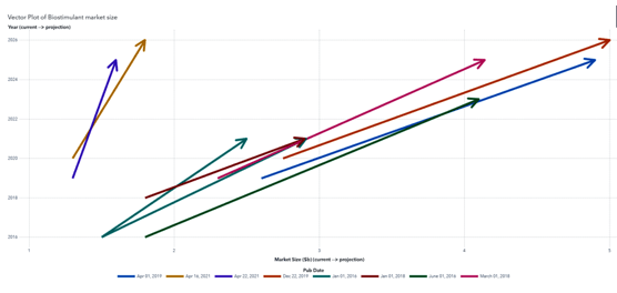 Figure 1: Vector plot of biostimulant market size reports. Each line represents a unique report, anonymized per its publication date. The X origin represents estimated market value at the time of publication. The X end represents the market size projection to the year corresponding to the Y axis. More horizontal line orientations indicate higher expected market growth rates (bullish), and more vertical lines indicate lower expected market growth rates (bearish).