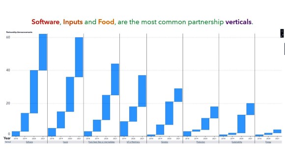 The study was done between September and October 2021, covering a period of January 2018 to September 2021. Two hundred sixty-six web searches were logged with 352 partnerships matching the criteria were identified. The partnerships were categorized according to subject, agriculture sub-vertical, phase (e.g. commercial, innovation, distribution, etc.), and by connection name (partnership, collaboration, alliance, etc.). A summary of sub-verticals and subjects are summarized (Appendix 1).