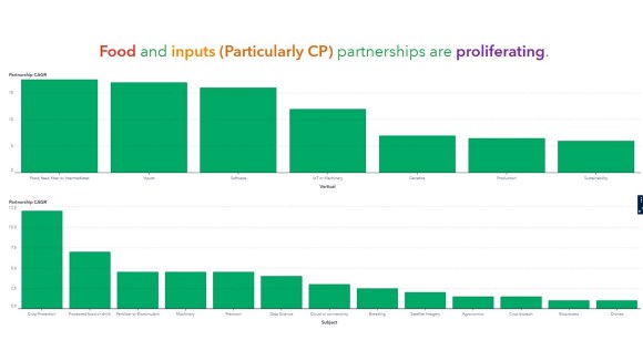 The fastest growing partnerships are the top 3 most common in reverse order: food-related partnerships (17.5% CAGR), inputs (17%) and software (16%) (Fig 6). Within these areas, there are notably high growth rates for crop protection (12%) and processed foods or drinks (7%). If these trends continue, we expect crop inputs and software development-related activity to remain prominent, while processed food and other FoodTech activity to surge.
