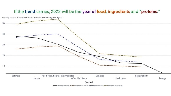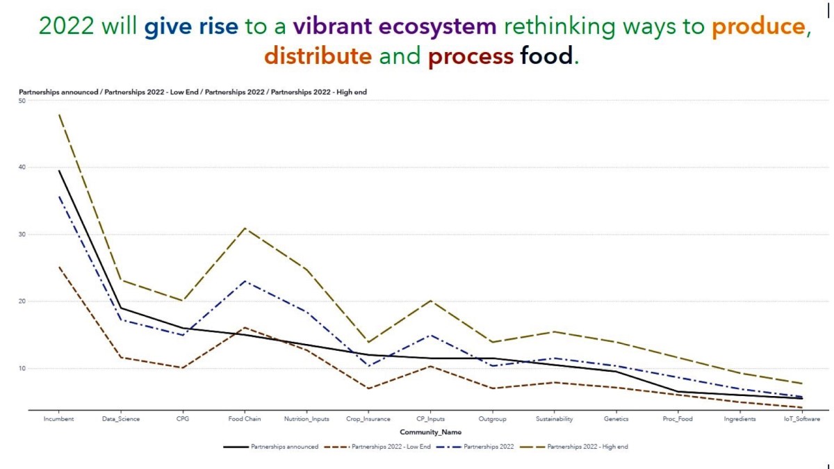 - The most (42 ± 14) partnerships will be in food, feed and fiber, an increase of a third from average of past 4 years. This is in part driven by inflationary pressures and consumer discretionary spending.