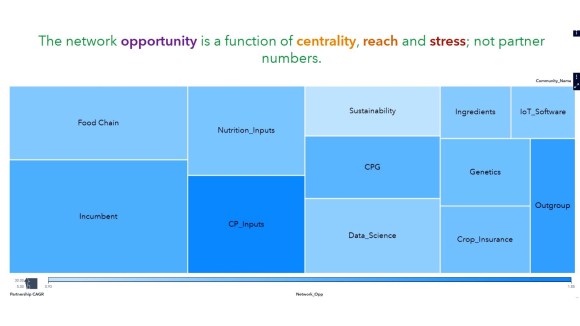 Looking deeper than partnership numbers, partnership requirements tend to be highly specific. Companies design partnerships to solve specific challenges like opening a new client base, augmenting a discovery platform, or to provide a critical software functionality that make business tasks run smoothly. Partnership choices should reflect a company’s networking opportunity, which is a function interconnectedness (closeness centrality), reach (how many introductions can be made) and stress (an indicator of novelty). The mean networking opportunity (shade of blue) within each community does not relate to the partnership growth rate (box size) within that community (Fig 11). This means companies are better off to choose collaborators based on the network effect, and not bandwagon leaders.