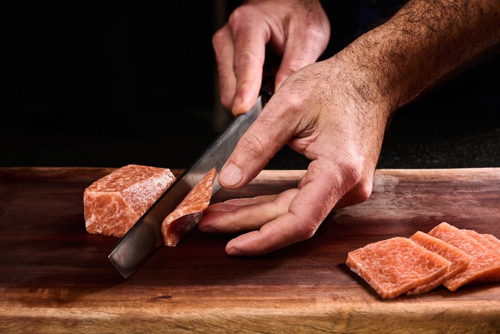The raw toro specialty is composed of the underbelly of the fish. It has the highest fat content, with especially high omega-3 levels. This awards it a unique buttery sensation, making it the most tender and desired meat of the fish. Wanda Fish’s cell-cultivated sashimi possesses the same sensory features of wild-sourced toro sashimi and is imbued with comparable nutritional richness, especially protein and omega-3 fatty acids.